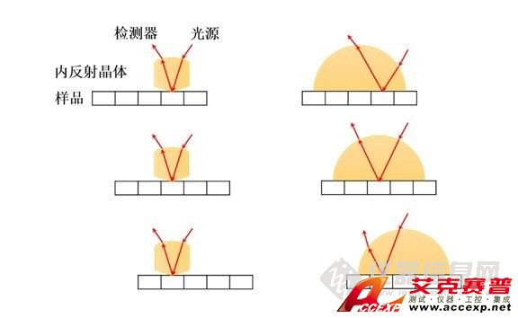 ATR模式包括ATR單點(diǎn)物鏡與ATR成像附件兩種測量方式。如圖2所示,如果使用ATR單點(diǎn)物鏡進(jìn)行成像分析,每次只能測量與內(nèi)反射晶體接觸的一個(gè)像素,然后使晶體與樣品脫離,移動(dòng)樣品使內(nèi)反射晶體接觸下一個(gè)像素并進(jìn)行測量,直到獲得所有像素的光譜。很明顯的問題是,內(nèi)反射晶體與樣品接觸后很容易被污染,影響后續(xù)像素測試結(jié)果的準(zhǔn)確性,而且所有像素逐個(gè)測量的方式非常耗時(shí)。如果使用ATR成像附件,內(nèi)反射晶體與所測樣品一起固定在樣品臺(tái)上,二者之間沒有相對(duì)位移,避免了晶體污染造成的測量誤差。樣品臺(tái)同步移動(dòng)內(nèi)反射晶體與所測樣品,改變紅外光束在內(nèi)反射晶體上的入射位置,完成所有像素的測量。由于可以使用陣列檢測器,ATR成像的測試速度也非??臁5?,受到內(nèi)反射晶體尺寸的影響,ATR成像的測試面積比較小(目前儀器上通常配備的反射晶體的直徑為500 mm,最大可以定制直徑為2 mm的晶體,但應(yīng)同時(shí)考慮檢測器、軟件等因素)。此外,ATR單點(diǎn)物鏡與ATR成像附件有個(gè)共同的問題:該方法只能測量距離內(nèi)反射晶體表面幾個(gè)微米深的樣品部分;在樣品表面與內(nèi)部不一致時(shí),該方法獲得的一般只是表面信息。